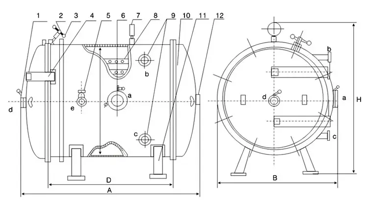 7 温度计     8 烘架    9 进出热水口法兰  10 箱体   11 腿       12 铭牌