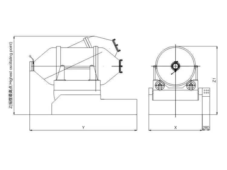 EYH系列二维运动混合机主要由转筒、摆动架、机架三大部分构成。转筒装在摆动架上,由四个滚轮支撑并由两个挡轮对其进行轴向定位。在四个支撑滚轮中,其中两个传动轮由转动动力系统拖动使转筒产生转动;摆动架由一组曲柄摆杆机构来驱动,曲柄摆杆机构装在机架上,摆动架由轴承组件支撑在机架上。