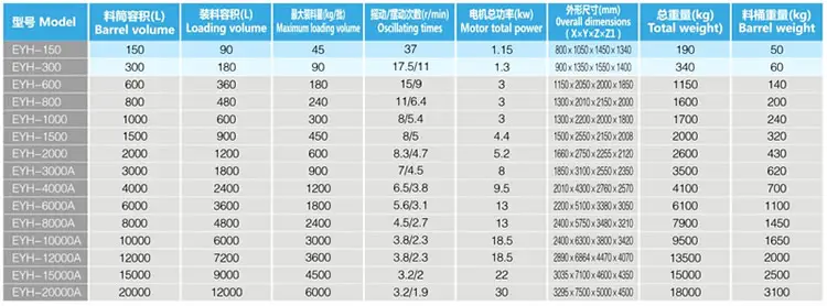 EYH系列二维运动混合机的转筒可同时进行二个运动,一个为转筒的转动,另一个为转筒随摆动架的摆动。被混合物料在转筒内随转筒转动、翻转、混和的同时,又随转筒的摆动而发生左右来回的掺混运动,在这两个运动的共同作用下,物料在短时间内得到充分的混合。EYH二维混科机适合所有粉、粒状物料的混合。